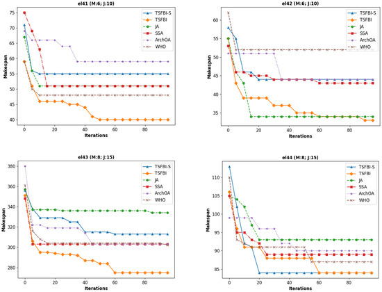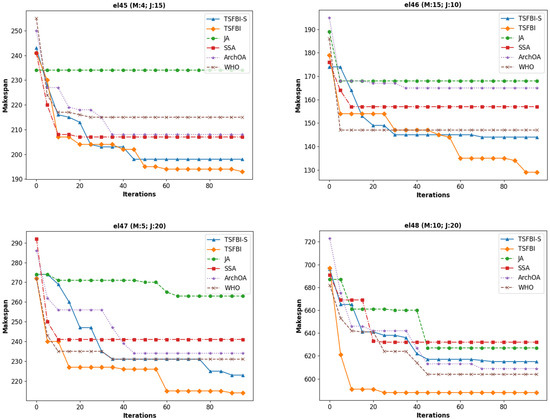 The results presented in Figure 6, Figure 7 and Figure 8 demonstrate the effectiveness of the proposed hybrid encoding method, enabling the application of continuous optimization algorithms like the FBI to the discrete DRFJSP. Notably, the FBI algorithm consistently converged to better solutions (lower makespan) than those of JA, SSA, ArchOA, and WHO within the same number of iterations across most Mk benchmark instances, highlighting its potential for solving complex scheduling problems efficiently.