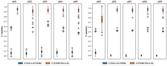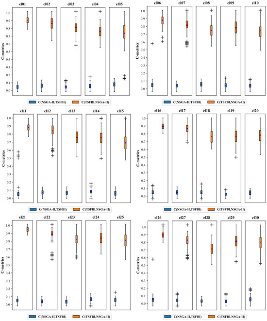 The extended instances (el01–el40) were optimized using the TSFBI and the NSGA-II, and three metrics, the C-metric, SM, and HVR, were statistically calculated. The statistics for the C-metrics are shown in Figure 9. To visually demonstrate the variances in the distribution of the solutions produced by the TSFBI and NSGA-II, we utilized box plots. Each plot compares five instances, with a total of eight plots encompassing instances el01–el40. The x-axis of each plot depicts the TSFBI and NSGA-II categories, while the y-axis represents the C-metrics.