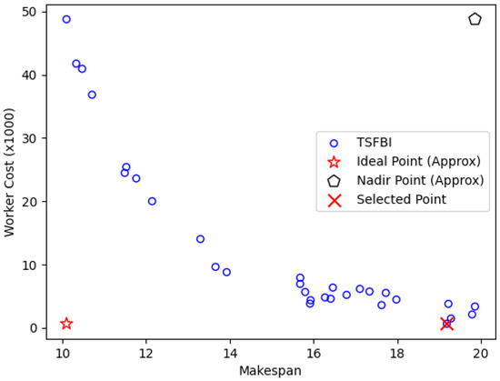 The Pareto solutions obtained using the TSFBI for the optimization calculation for the simple case are shown in Figure 10. This study focused on two objectives, namely the completion time and worker cost, with a particular emphasis on the worker cost. The importance of these objectives was determined by assigning them ratings from 1 to 9 to construct the judgment matrix A. Therefore, the decision-maker’s preference for minimizing the worker cost was set at 8, while a rating of 1 is assigned to the minimization of the makespan. Using the weight calculation steps in Section 4.2, the weight vector was calculated: