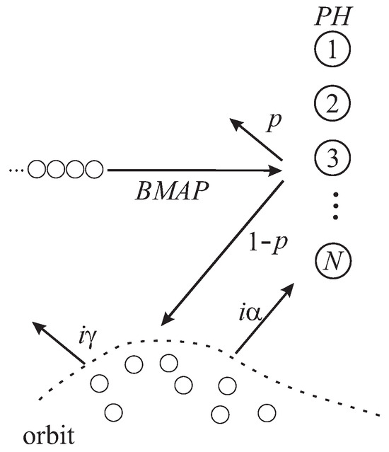 The predominant body of study in queueing theory, particularly concerning retrial queues, focuses on systems with a stationary Poisson arrival process defined by a constant customer arrival rate. It is already well recognized that an arrival rate can fluctuate in many real-world systems. As a good model of arrivals with varying instantaneous arrival rates, the Markov arrival process () and its generalization, such as the batch Markov arrival process (), are introduced in, e.g., [11,12]. For more information about the , its properties, usefulness for modeling real-world flows, and literature surveys, see [13,14,15,16,17]. The modeling of real-world flows by the allows one to catch the inherent features of such flows as the fluctuating arrival rate, dependence between successive inter-arrival times, and possible high variance of these times. The issue of matching real-world flows with the has been thoroughly examined in the current literature; refer to, for instance, [17,18,19] and the citations therein.