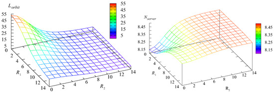 The mean quantity of busy servers sharply increases with growth in the parameters and when and are small, e.g., less than 6. This can be explained by the fact that with such growth, the mean quantity of customers in orbit decreases, which causes the decrease in the loss probabilities of a customer due to impatience , and ; see Figure 3 and Figure 5. The fewer customers are lost, the more customers receive service and the more servers are busy. With further growth in and , the value of grows less essential and then starts to slowly decrease. This is caused by the fact that the growth in and causes the increase in the loss probabilities of customers upon arrival , and ; see Figure 4 and Figure 5.