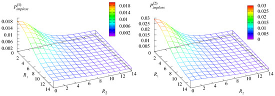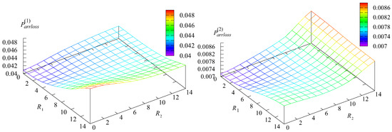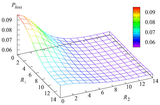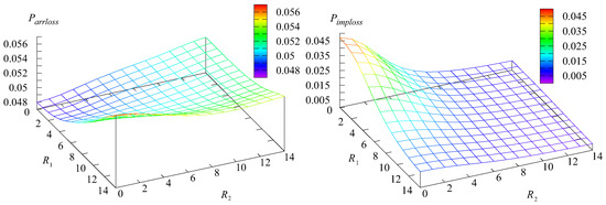 The total loss probability for a customer is the sum of the probabilities and . In this experiment, the probability is more sensitive to the parameters and , resulting in exhibiting behavior akin to that of . However, in contrast to , the probability behaves non-monotonically. It takes its minimal value of 0.05752 for and The fact that the optimal value of is less than the optimal value of i.e., the restriction of retrying customer access is more strict under state 1 of the fundamental process, is intuitively clear. Since the arrival rate of primary customers during state 1 is essentially higher, it makes sense to restrict the access of retrying customers more strongly.