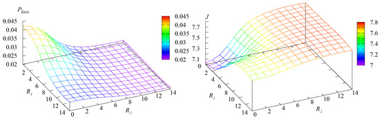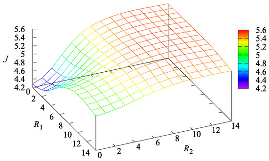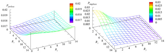The dependencies of the loss probabilities , , and and the cost criterion J on the different values of and are shown in Figure 8 and Figure 9.