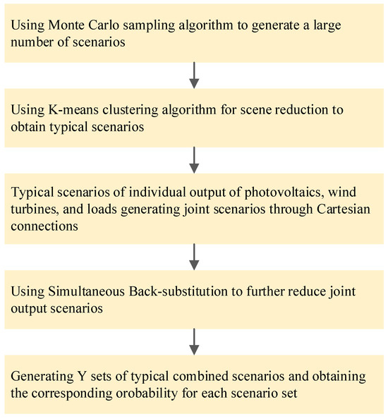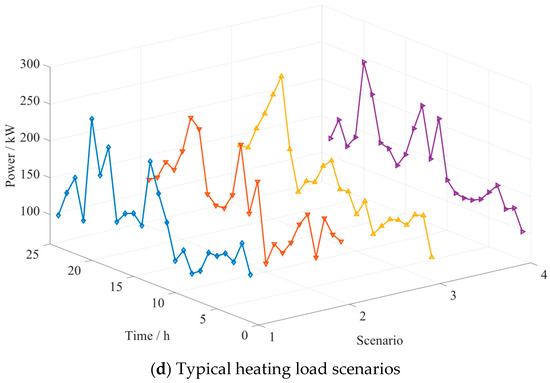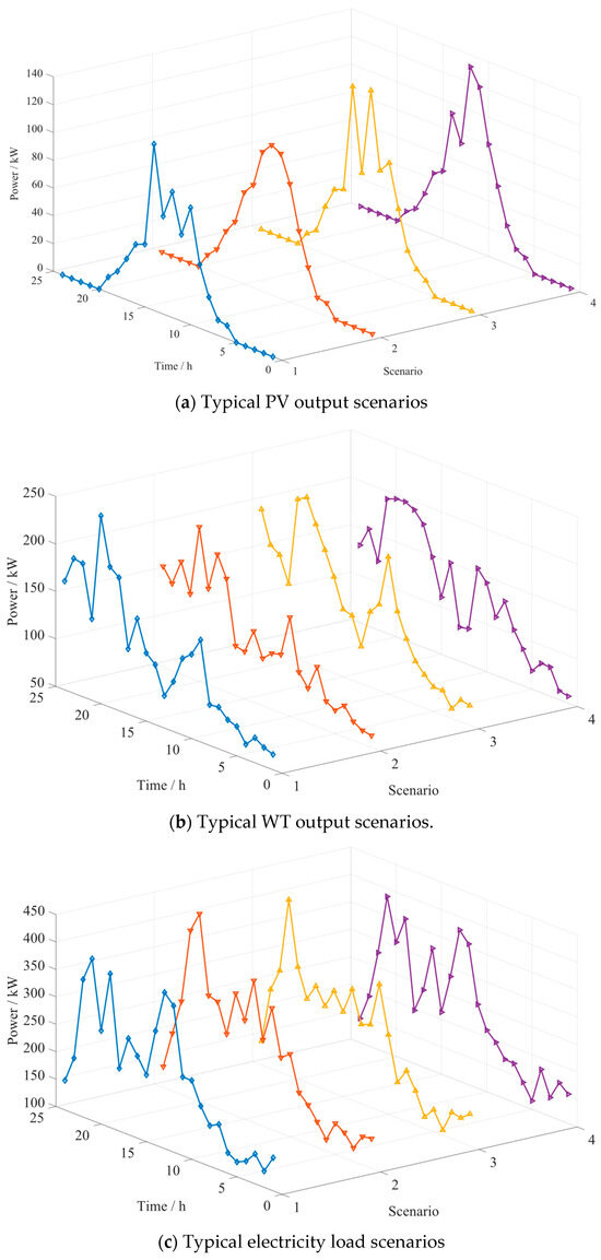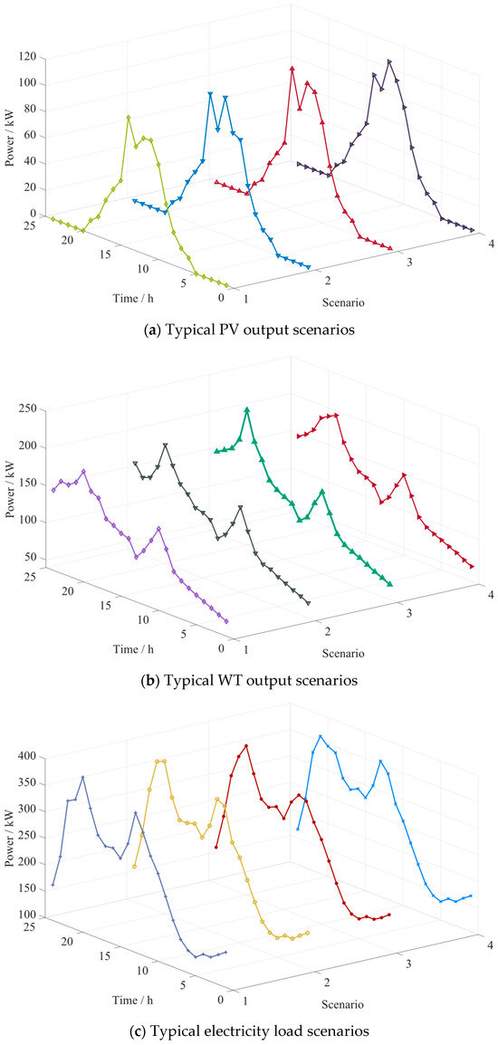 First, the use of typical scenarios obtained by combining the MC sampling method with the K-means clustering algorithm is proposed to describe the uncertainties in PV, WT, and loads. The MC, through completely random sampling, could capture extreme scenarios, such as extremely high or low PV and WT outputs, as well as load demand. This allows for testing the system’s performance under worst-case conditions, ensuring the reliability of the scheduling strategy, enhancing the model’s robustness, and mitigating the risk of high operational costs in practical applications. Distinguished from traditional approaches that focus on single energy sources or simplified scenarios, this method better aligns with the operational characteristics of complex real-world energy systems. Compared to other methods, such as Latin Hypercube Sampling (LHS), which is constrained by stratified sampling, it may result in insufficient scenario coverage, failing to adequately capture extreme scenarios; this limitation can lead to suboptimal model performance under extreme conditions, thereby increasing the risk of higher operational costs in practical applications.
