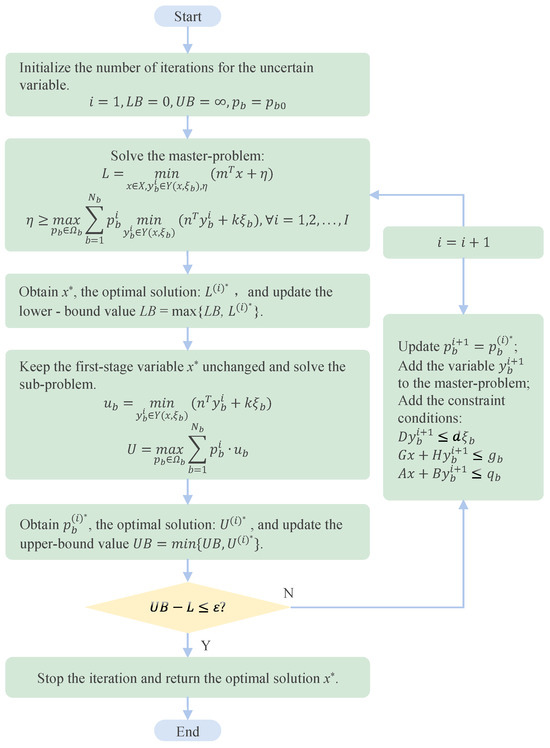 Second, a two-stage DRO model is employed to address the uncertainties in PVs, WTs, and loads within the system, achieving a balance between economic efficiency and robustness in the optimization scheduling process. The master problem constructs the objective function by comprehensively considering multiple cost factors, including equipment operation, energy procurement, energy storage costs, curtailment costs of WT and PV power, DR compensations, and carbon emission costs. Additionally, strict constraints, such as equipment capacity limits, charging and discharging efficiency, and ramping constraints, are imposed to minimize the overall system cost. The subproblem focuses on addressing uncertainties, providing a reliable optimization framework for addressing complex energy environments and uncertainty management. It effectively balances the economic efficiency and robustness of the scheduling results. Additionally, by incorporating a DR operational mechanism, the distribution of electricity and heating loads is optimized, further enhancing system operation and reducing system operating costs.
