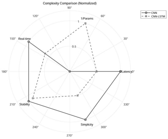 Figure 2 presents a radar chart that compares the two models in terms of five normalized criteria, namely, inverse latency, inverse parameter count, real-time suitability, training stability, and architectural simplicity. To enable fair comparison, all scores are normalized to the range [0, 1]. The inference times for the CNN and CNN–LSTM models were measured as 9.68 ms and 18.29 ms, respectively, and the corresponding parameter counts were 34.7 million and 9.8 million. These values were normalized using inverse scaling, with each score computed as follows: . The qualitative metrics were scored based on architectural depth, convergence behavior, and observed inference consistency. The CNN model demonstrates strong advantages in four out of five dimensions, particularly in inference latency and deployment efficiency, while the CNN–LSTM model benefits from a smaller parameter count. Table 2 provides the corresponding numerical results.