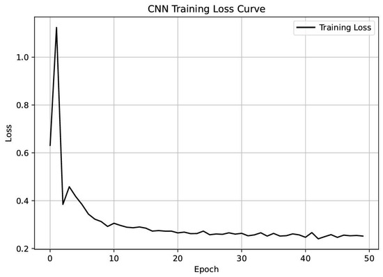 Figure 4 illustrates the training loss curve of the CNN model. The loss rapidly decreases within the first ten epochs and converges smoothly, remaining stable with minimal fluctuations throughout the remaining training process. This confirms that the model learns efficiently and is not prone to overfitting.