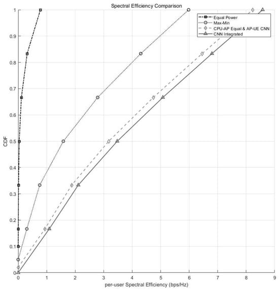 Figure 5 shows the CDF plot of the per-user SE. The CNN integrated method achieves the best overall performance, with a right-shifted curve compared to the other methods. A larger portion of users attain higher SE values, and the per-user average SE is also higher. However, the difference in SE between the two CNN-based methods is relatively small, as both effectively learn user-specific allocation patterns. The EPA method performs the worst, as it does not account for spatial or channel variability. The max–min method improves fairness but sacrifices overall throughput. The stage-wise CNN approach provides notable improvement over traditional baselines but is limited by its fixed CPU-to-AP allocation, which restricts full spatial optimization.