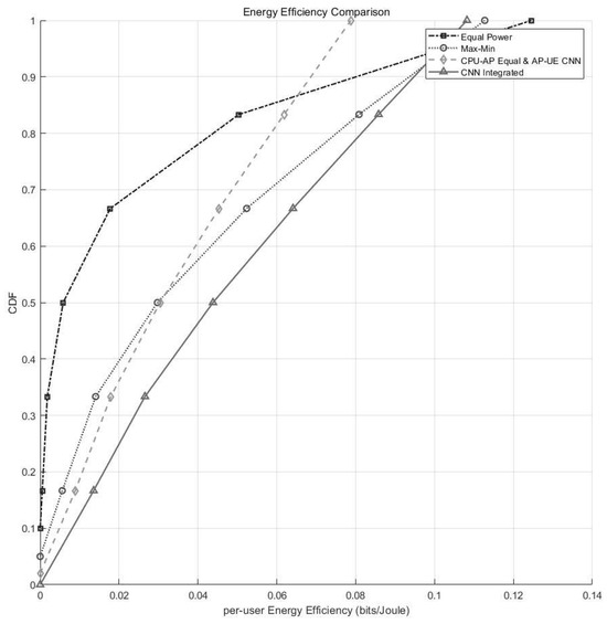 Figure 6 illustrates the CDF plot of the per-user EE. While SE and EE often trade off against each other, the CNN integrated model shows strong performance on both fronts. It achieves the most right-shifted EE curve, demonstrating that users can maintain high data rates with reduced power consumption. This is because the model learns to avoid unnecessary transmission by APs with poor link conditions, and allocates more power only where it is most effective. The stage-wise CNN model achieves similar SE but lower EE, as it cannot control how much total power is delivered to each AP. Even when some APs are underutilized, they still consume fixed power, reducing the overall EE. In contrast, the integrated model dynamically adjusts both AP-to-UE and CPU-to-AP allocations, enabling global energy savings without sacrificing throughput. EPA has the worst EE performance due to its indiscriminate power usage. Max–min guarantees minimum service levels, but is not energy-aware and often allocates excessive power to weak links.