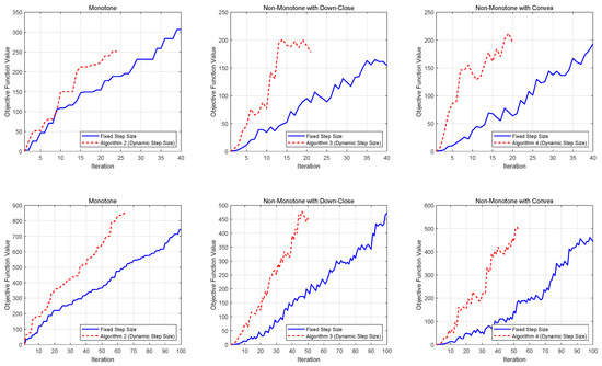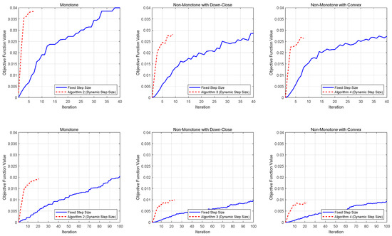 The computational complexities of the algorithms designed to address the three constrained DR-submodular function maximization problems outlined earlier are compiled in Table 2. The results presented in the table reveal that the dynamic stepsize strategy introduced in this work offers a significant advantage in terms of complexity over the constant stepsize approach, both for the MLE and softmax relaxation problems. However, in the quadratic case, a definitive comparison of their complexities cannot be made, because they are determined by the -norm of the linear term vector and the -norm of the quadratic term matrix, respectively, and there is no inherent relationship between the magnitudes of these two quantities.