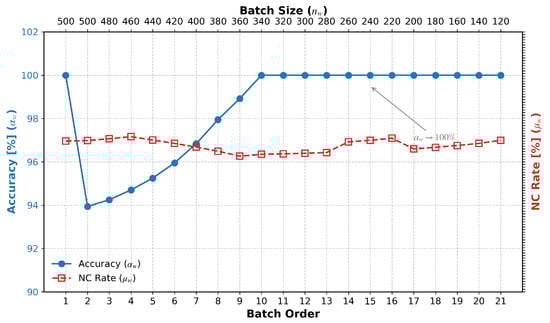 As seen in Table 7, the first batch of parts undergoes full inspection to determine the minimum number of inspection items. From the second batch onward, the inspection items selected from the first batch are used, while the number of parts gradually decreases. As the number of parts decreases, the NC rate of parts remains stable. When the number of parts is reduced to a certain level, the accuracy of the minimal inspection item method detection is the same as that of the traditional inspection method, and ultimately, it trends toward zero defects.