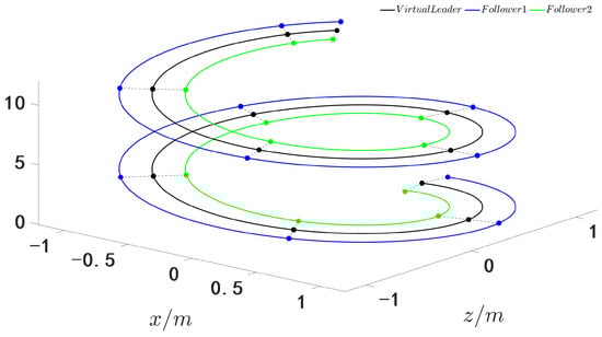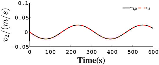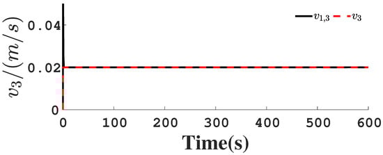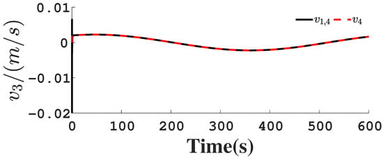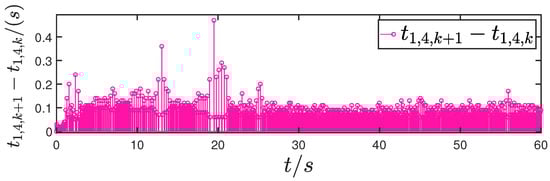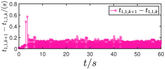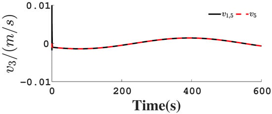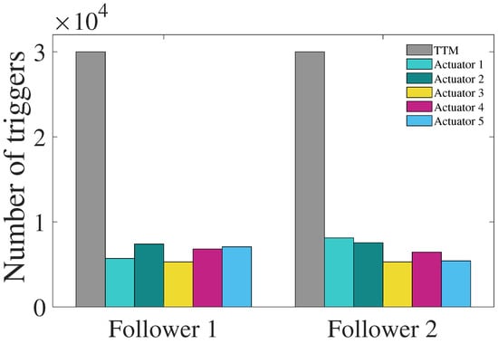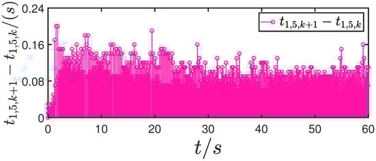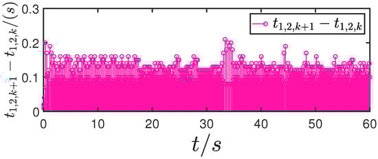 The simulation results are shown in Figure 1, Figure 2, Figure 3, Figure 4, Figure 5, Figure 6, Figure 7, Figure 8, Figure 9, Figure 10, Figure 11, Figure 12, Figure 13, Figure 14, Figure 15, Figure 16, Figure 17, Figure 18, Figure 19, Figure 20, Figure 21, Figure 22, Figure 23, Figure 24, Figure 25, Figure 26, Figure 27, Figure 28, Figure 29 and Figure 30. Figure 1 illustrates the trajectory of two AUVs following the virtual leader. The three components of the tracking error for position and attitude are shown in Figure 2, Figure 3, Figure 4, Figure 5 and Figure 6. The tracking of the linear and angular velocities of the AUVs is shown in Figure 7, Figure 8, Figure 9, Figure 10 and Figure 11. Figure 12, Figure 13, Figure 14, Figure 15 and Figure 16 illustrate the variation of the control input signal. Figure 17, Figure 18, Figure 19, Figure 20 and Figure 21 show the observation errors for position and attitude. The tracking of unmeasurable velocities by the observer is demonstrated in Figure 22, Figure 23 and Figure 24. Figure 25, Figure 26, Figure 27, Figure 28 and Figure 29 illustrate the update interval for the control signals. A comparison of the number of signal updates for each actuator is shown in Figure 30.