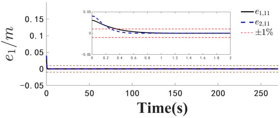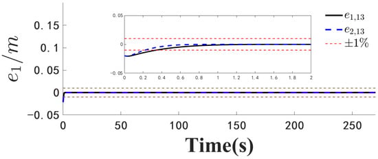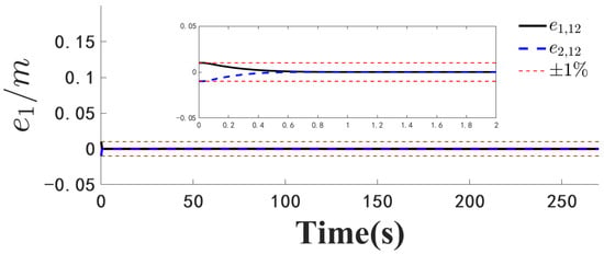 The developed control strategy guarantees fixed-time stabilization for AUV systems operating under state constraints and subject to unknown time-varying disturbances. As established in (31), the system achieves convergence within a finite time interval whose upper bound is completely determined by the controller design parameters, independent of initial conditions or external disturbances. This fixed-time convergence property is rigorously demonstrated through the Lyapunov-based analysis in (31), where the settling time bound is shown to depend solely on the selection of the control gains.