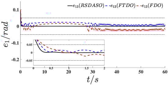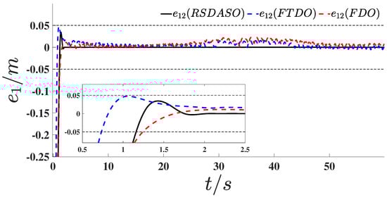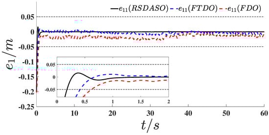 In order to demonstrate the superiority of the present method (RSDASO), it was compared with the Fixed Time Disturbance Observer (FTDO) [31] and Finite Time Disturbance Observer (FDO). The simulation results are shown in Figure 31, Figure 32 and Figure 33. The figures demonstrate a comparison of the AUV position and attitude tracking errors under different control strategies. As shown in Figure 31, the proposed RSDASO method (black curve) exhibited significant advantages over the two control strategies, FTDO (blue dashed line) and FDO (red dashed line), in terms of the position tracking error . During the initial stage (near ), although the errors of all three methods showed notable changes, the RSDASO method demonstrated a faster error convergence rate, rapidly approaching zero error. From to 1 s, its error fluctuated with a smaller amplitude and stabilized quickly. After the system stabilized, the error curve of the RSDASO method remained within a narrow fluctuation range, maintaining a level close to zero, which highlights its high positional tracking stability. In contrast, while the error curves of FTDO and FDO also tended toward zero, their fluctuation amplitudes were larger than those of the RSDASO method, particularly for the FDO method (red dashed line), which exhibited more pronounced error fluctuations throughout the entire time period. Further analysis of the position tracking errors in the other two degrees of freedom, as shown in Figure 32 and Figure 33, revealed that the RSDASO method achieved faster error convergence in the initial stage, exhibited smoother error curves with significantly smaller fluctuation amplitudes during the intermediate stage, and stabilized errors at a level closer to zero with the smallest fluctuation range in the later stage. Collectively, the RSDASO method demonstrated superior performance in convergence speed, stability, and error control accuracy across all degrees of freedom, underscoring its excellent efficacy in trajectory tracking control.