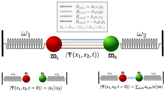where () is the momentum operator; are the mass and frequency of oscillator i, respectively; coefficients determine the coupled between two oscillators with the interaction energy . Often, in quantum optics, Equation (1) can be seen through the operators of particle creation and annihilation ; in this case, the Hamiltonian will be