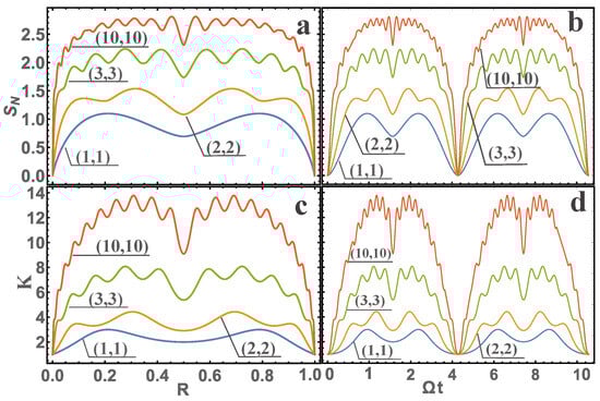 The dependence of the von Neumann entropy in Figures (a,b), as well as the Schmidt parameter in Figures (c,d) as a function of R (for (a,c)) and (for (b,d)) is presented. In the figures, the dependencies are presented for different initial values of the quantum numbers , so that . For example, for and , the notation (1,1) is introduced.