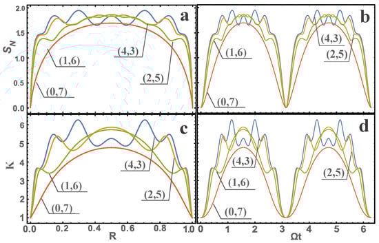 The dependence of the von Neumann entropy in Figures (a,b), and the Schmidt parameter in Figures (c,d) as a function of R (for (a,c)) and (for (b,d)) is presented. In the figures, the dependences are presented for different initial values of the quantum numbers , so that . For example, for and , the notation (1,6) is introduced.