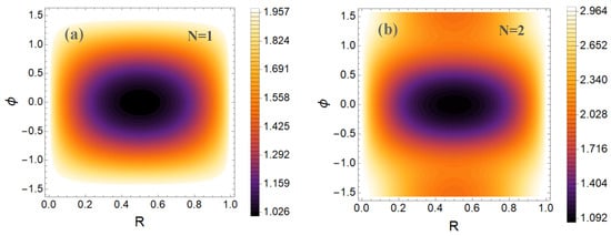 From Figure 4, it is evident that quantum entanglement will always be maximal at and for the reason explained above in the analysis of Equations (8)–(11). Also evident is the tendency for quantum entanglement to decrease at and . We add that with increasing quantum number N, the dependence of entanglement on R and for will be close to Figure 4.
