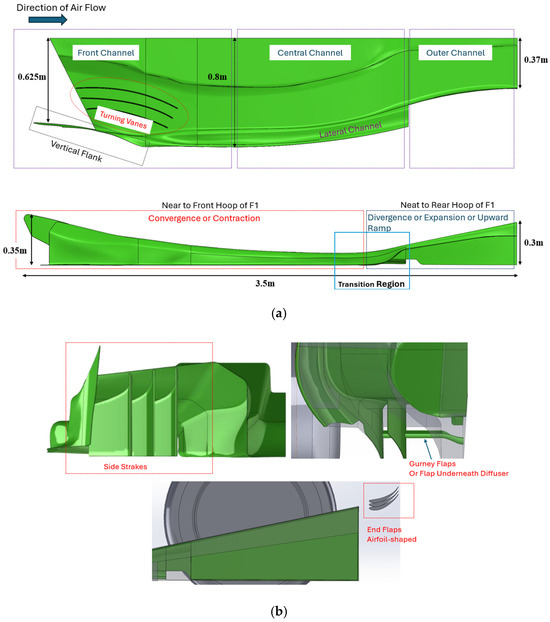 Illustration of the modeled diffuser geometry, highlighting various structural components of the underbody with labeled dimensions: (a) outer, central, and front channel zones, lateral zone, vertical flank, turning or guiding vanes, contraction zone, and expansion zone; (b) side strakes, Gurney flaps or flaps beneath the diffuser, and the end-flaps with an airfoil shape.
