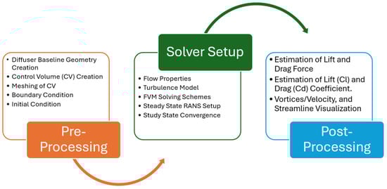 CFD methodology illustrating the important used for optimizing the diffuser configuration which includes 1. Pre-Processing, 2. Solver Selection, and 3. Post-Processing.