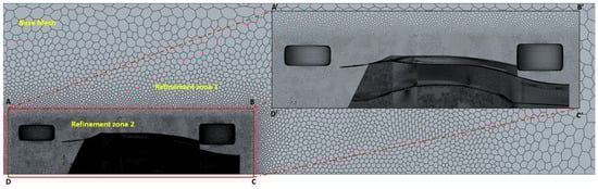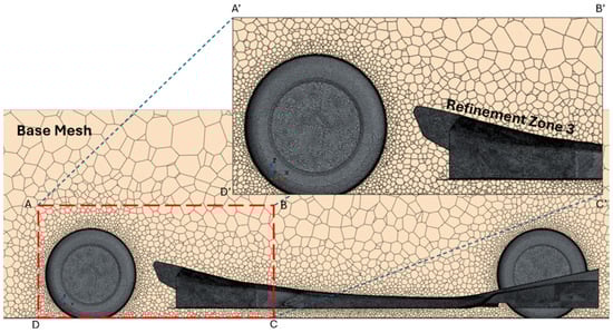 Due to center-plane symmetry of the undertray, only half the geometry of the undertray, including the tire, was modeled in SolidWorks Premium (2023-2024) to optimize computational resources usage, as discussed in Section 2.2 and Section 2.3. Analyzing the aerodynamics of an F1 car involves addressing fluid–solid interaction challenges, requiring the definition of boundaries for a virtual wind tunnel to study airflow interactions with the car’s solid components. The diffuser geometry, along with the tire, was subtracted from a rectangular computational domain to establish the necessary boundary conditions. To minimize the influence of boundary effects, the domain boundaries were positioned sufficiently far from the diffuser and tires. Furthermore, two local refinement zones were introduced to control mesh element density and accurately capture downstream wake patterns. The dimensions of the computational domain were adopted from the existing literature to ensure alignment with established methodologies [30] (Figure 7).