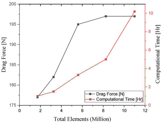 A mesh independence study for the diffuser region was conducted using five progressively refined base mesh sizes: 10 mm, 7 mm, 5 mm, 4 mm, and 3 mm. The results, summarized in Table 3, reveals that the mesh with 4 mm grid size on the diffuser, comprising approximately 8.25 million cells, produced results nearly identical to the highly refined 3 mm mesh. Importantly, the 4 mm mesh achieved good accuracy in aerodynamic force predictions, i.e., drag force, while reducing computational time by 50%, as illustrated in Figure 10.