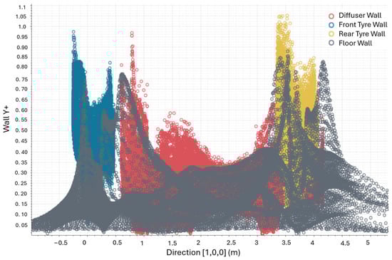 Based on these findings, the 4 mm base mesh was selected as the optimal configuration for subsequent simulations, balancing accuracy and computational resources (cost wise). It was also ensured that the Y+ values near the walls were adjusted below 1, as required for capturing turbulence flow physics. Figure 11 illustrates the Y+ values maintained along the length of the underbody for various structural components in our simulation, including the diffuser, front tire, rear tire, and floor. It demonstrates that Y+ values below 1 are achieved, ensuring accurate analysis of the aerodynamic properties of all components. These simulations were run on a standalone computer with the following specifications: Intel® Core™ i7-14700 processor, featuring 20 physical cores and 28 logical cores with a base clock speed of 2.10 GHz; 32 GB of RAM; and an NVIDIA GeForce RTX 4060 GPU. The simulation times were recorded accordingly.