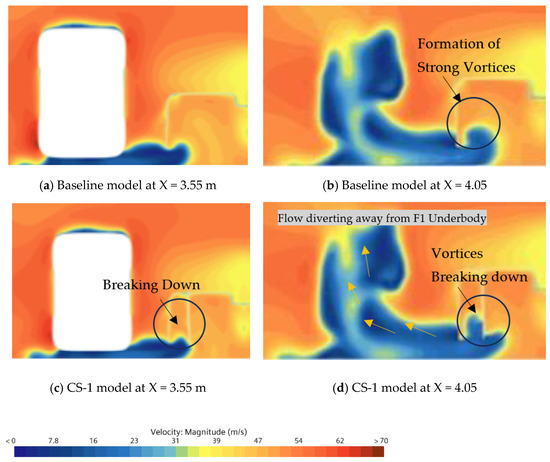 Velocity contour comparison between Case Study 1 (c,d) with baseline model (a,b) at two different cut planes, X = 3.55 m (a,c) near front tire and X = 4.05 m (b,d) at rear side of front tire, showing breakdown of vortices and flow diverting away from F1 diffuser.