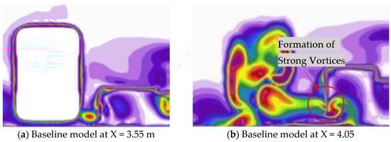 Figure 12a,c compare the velocity contour our baseline model with CS-1 at X = 3.55 m, showing that the breakdown of vortices starts at the front tire, resulting in a slight reduction in drag force by 0.23% (see Table 4). However, with the addition of a single lateral vane, we observe a breakdown of vortices caused by the vane wall and incoming flow, leading to a 13.49% increase in downforce on the rear tire (see Table 4), as shown in Figure 12b,d. Due to the vane outward position, the flow is redirected away from the F1 car, highlighting the importance of using an undertray to optimize aerodynamic performance. Similar information is shown by vorticity contour in Figure 13.