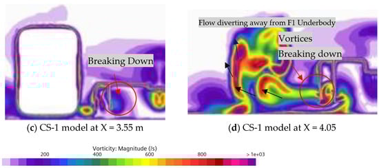 Vorticity contour comparison between Case Study 1 (c,d) with baseline model (a,b) at two different cut planes, X = 3.55 m (a,c) near front tire and X = 4.05 m (b,d) at rear side of front tire, showing breakdown of vortices and flow diverting away from F1 diffuser.