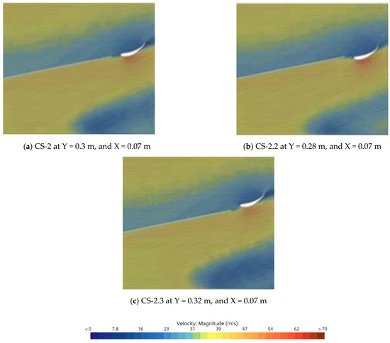 Velocity contour showing flow physics variation on varying end-flap height, (a) CS-2, (b) CS-2.2, and (c) CS-2.3.
