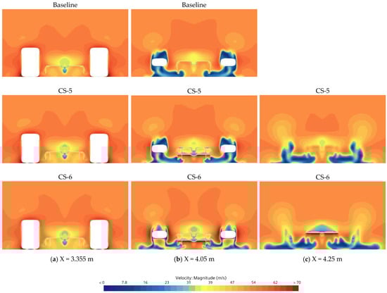 Velocity contours at (a) X = 3.355 m, (b) X = 4.05 m, and (c) X = 4.25 m, illustrating the flow around the diffuser with added structural features, comparing the baseline model with the CS-5 and CS-6 designs.