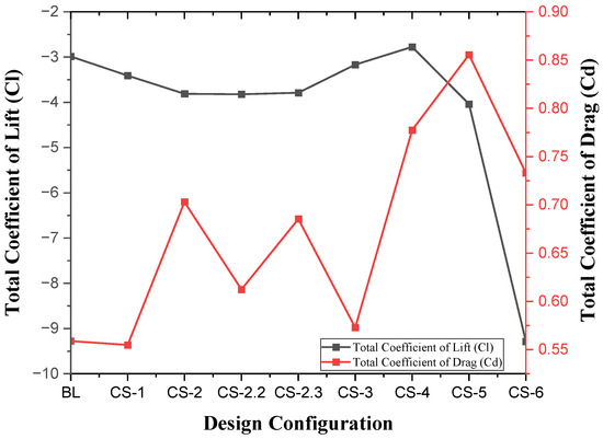 The CS-4 and CS-5 configurations exhibited the lowest performance due to the poor fluid–solid interaction between the divergence and each flap, which resulted in more drag and caused a reduction in the performance of the diffuser (also illustrated in Figure 16a,b). In contrast, adding a flap in the lateral channel of the diffuser resulted in the production of additional downforce, while also creating a low-velocity zone (high pressure zone), leading to higher drag values. Furthermore, a significant changes were observed in flow field were observed due to the placement of an airfoiled cross-sectioned flap causing a suction effect creating this additional downforce.