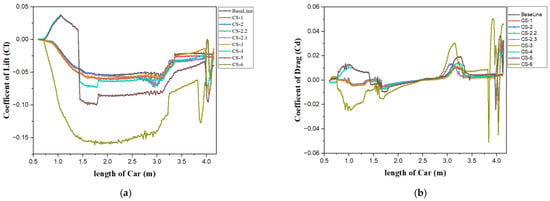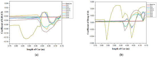 In the diffuser section, CS-6 generates the highest downforce; however, it also results in greater drag. The smallest improvement in downforce performance was observed in CS-1. CS-5 and CS-6 modifications were found to be the most effective diffuser modifications, as shown in Figure 20. Figure 20a clearly shows the interaction between various modifications, especially visible for CS-5 and CS-6.