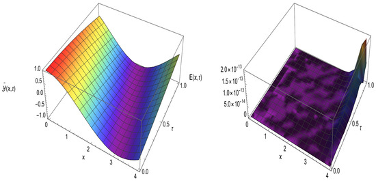 Moreover, Figure 2 displays space–time graphs illustrating the absolute error functions for Example 5 with different values of N, specifically , , , and , using parameters and . These graphs represent how the error is distributed across both spatial and temporal domains, providing insights into the accuracy of the proposed method. A clear trend emerges, showing that as N increases, the errors diminish considerably, reinforcing the method’s reliability in terms of accuracy and convergence. Additionally, Figure 3 illustrates the space–time graphs of the approximate solution on the left and its absolute error function on the right for Example 5, considering , and . The approximate solution demonstrates smooth and precise behavior, while the corresponding absolute error remains low, further substantiating the accuracy of the proposed approach. These findings affirm the efficiency of the method in handling complex DEs.