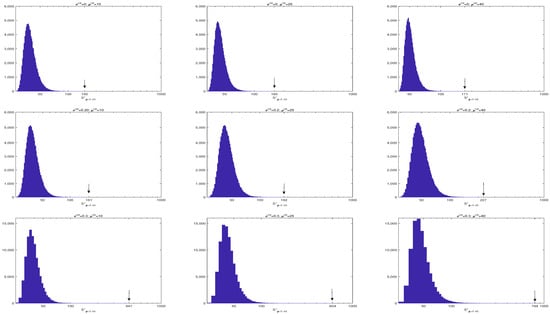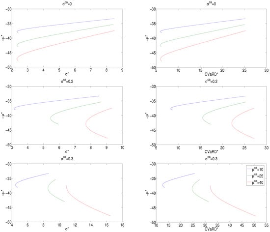 Figure 3 displays systemic frontiers for and , in the three CO2 price volatility scenarios characterized by for . In the case of CVaRD, the confidence level has been chosen as equal to . The wind penetration has been chosen as equal to , in agreement with the US planned target reported in the ‘Renewable Electricity Futures Study’ published by the National Renewable Energy Laboratory []. Also documented in the ‘IEA Wind—2023 Annual Report’ [], several European countries have similar targets, and Denmark reached a wind penetration of in 2023.