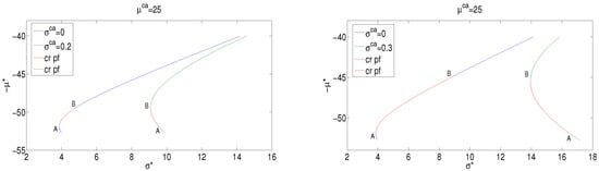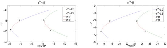 Portfolio A is the mvp portfolio in the non-volatile carbon tax scenario. Under volatile CO2 scenarios, portfolio A becomes an inefficient choice. In fact, such a portfolio is located in the red part of the green systemic frontier. The mvp and all portfolios belonging to the red portion of the blue frontier, from portfolio A to portfolio B, are located in the red portion of the green frontier and become inefficient choices. On the other hand, high values of CO2 price volatility reduce the planner choice set. Figure 6 depicts systemic mean-CVaRD frontiers for dispatchable only sources (left panel) and in the case in which the wind source is included in the power system (right panel) for in the two CO2 volatility scenarios and . In this case, A is the mcp portfolio in the scenario. Since the planner choice can regard only efficient systemic portfolios belonging to the green frontier (the high volatility scenario), critical portfolios (the red portion of the green frontier) which would be efficient under lower CO2 price volatility levels (the red portion of the blue frontier) are excluded by the choice set.