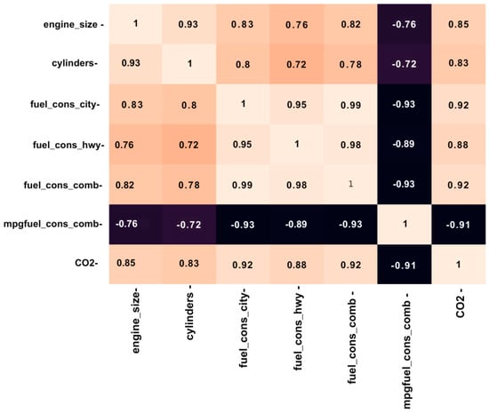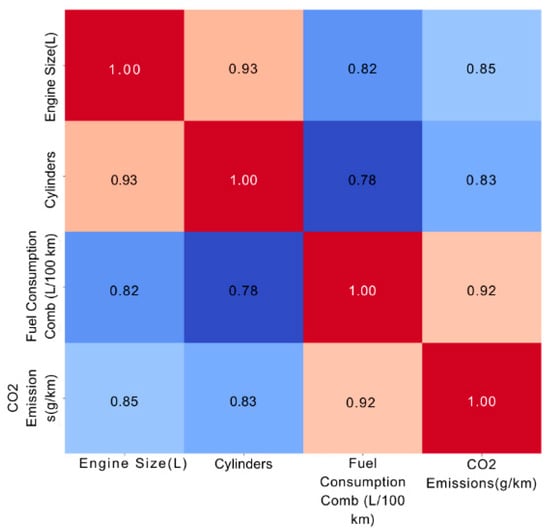 Figure 7 presents a heatmap that visualizes the correlations between critical features in the emissions dataset after the feature selection process, (color: dark red = strong positive, light = weak, dark blue = strong negative). The heatmap focuses on variables that are most relevant for predicting emissions, including engine size (L), number of cylinders, fuel consumption (combined L/100 km), and emissions (g/km). The strength of the correlations is represented by the color intensity, with darker red shades indicating stronger positive correlations and lighter shades indicating weaker relationships.