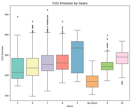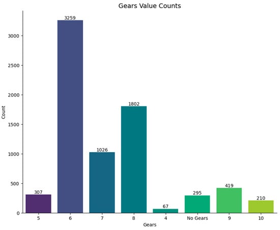 Figure 5 presents the number of vehicles per the number of gears available in each vehicle as a frequency distribution. This bar chart also, in a simple manner, presents information on how frequently each gear configuration is encountered in the dataset. Analyzing gear counts has value because it is a way of defining tendencies in values of vehicle design and fixes for interpreting observed emissions in the analyzed dataset. It also assists in analyzing the utilization of distinct gear configurations and their effect on the environment.
