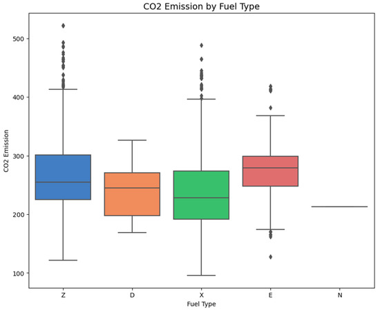 The characteristics of the dataset cover aspects of basic vehicle description, including model type, transmission system, refueling type, and fuel consumption rates, all of which are crucial to defining a vehicle’s emission factors. All these features are named using standard four-letter alphanumeric codes for ease of analysis. For instance, the vehicle model is categorized based on its drivetrain configuration and body structure, including options such as four-wheel drive (4WD/4 × 4), all-wheel drive (AWD), flexible-fuel vehicles (FFV), as well as short (SWB), long (LWB), and extended wheelbases (EWB). These distinctions are critical, as they directly relate to the vehicle’s performance and, consequently, its emissions.
