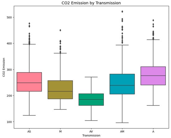 Figure 4 studies the trends in emissions for the variants in the transmission type: automatic, manual, and continuously variable transmission (CVT). The plot enables the comparison of how transmission technology affects emissions. It is thus essential to determine these differences to evaluate which of the transmission systems is less hostile to the environment and can give some clues to the compromises between power and fuel consumption and emissions.