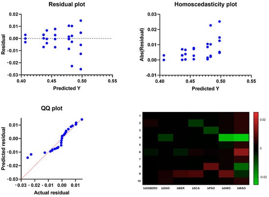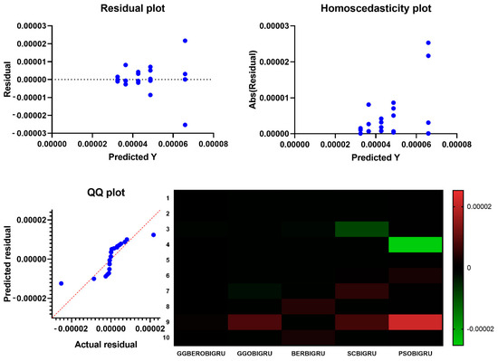 Illustrating the performance of the proposed BIGRU-based model optimized by different algorithms via residual plot, homoscedasticity plot, and QQ plot.