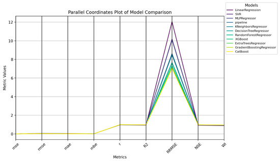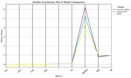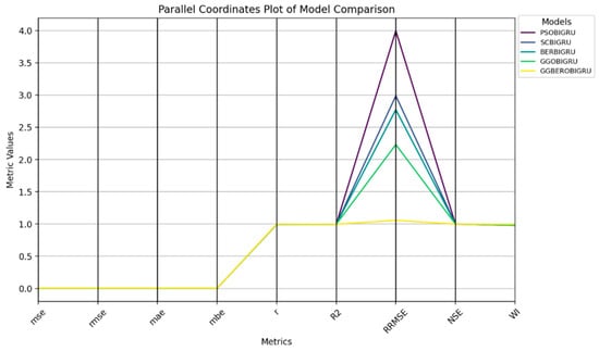 Parallel coordinates plot of model comparison for the BIGRU-based model optimized by different algorithms.