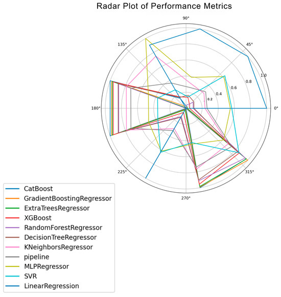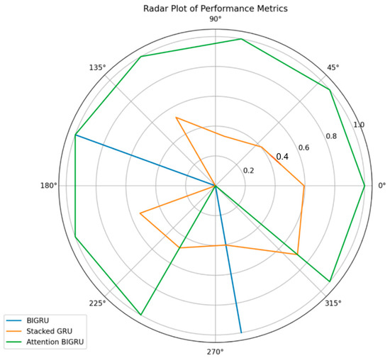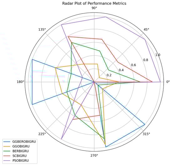 Radar plot of performance metrics for the BIGRU-based model optimized by different algorithms.