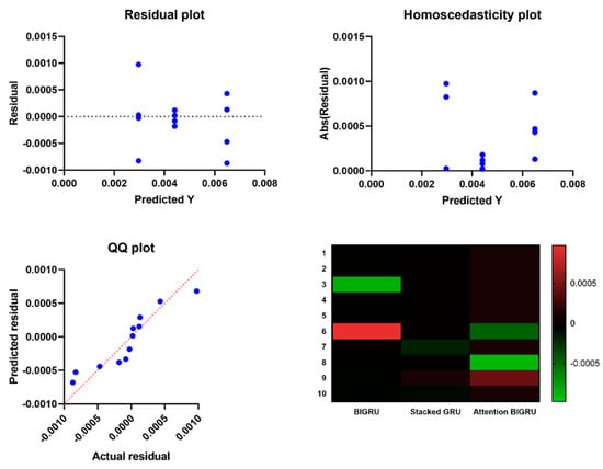 Illustrating the performance of the proposed deep learning models method via residual plot, homoscedasticity plot, and QQ plot.