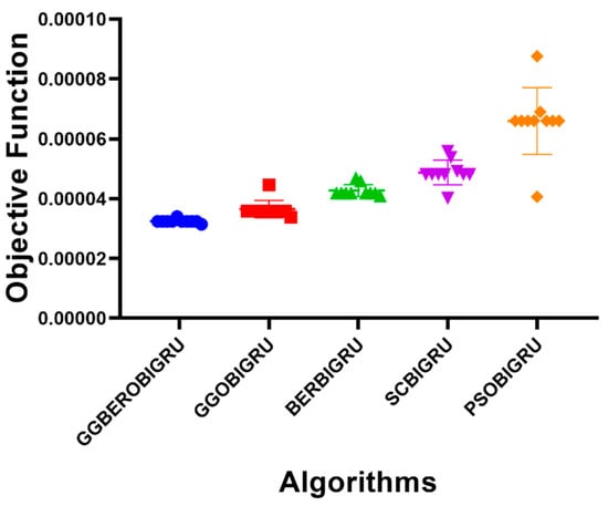 Table 11 compares the performance of the BIGRU model when optimized using different algorithms, including GGBERO-BIGRU, GGO-BIGRU, BER-BIGRU, SC-BIGRU, and PSO-BIGRU. The table clearly shows that the hybrid GGBERO-BIGRU optimization yields the best results, with the lowest MSE (1.0 × 10−5) and RMSE (3.2 × 10−5). These results underline the value of combining GGO and BER in optimizing deep learning models, leading to higher accuracy and faster convergence compared to traditional or single-approach optimizations. The significant improvement in model accuracy when using GGBERO-BIGRU optimization suggests that the hybrid approach effectively balances exploration and exploitation, resulting in a more refined and robust feature selection process.