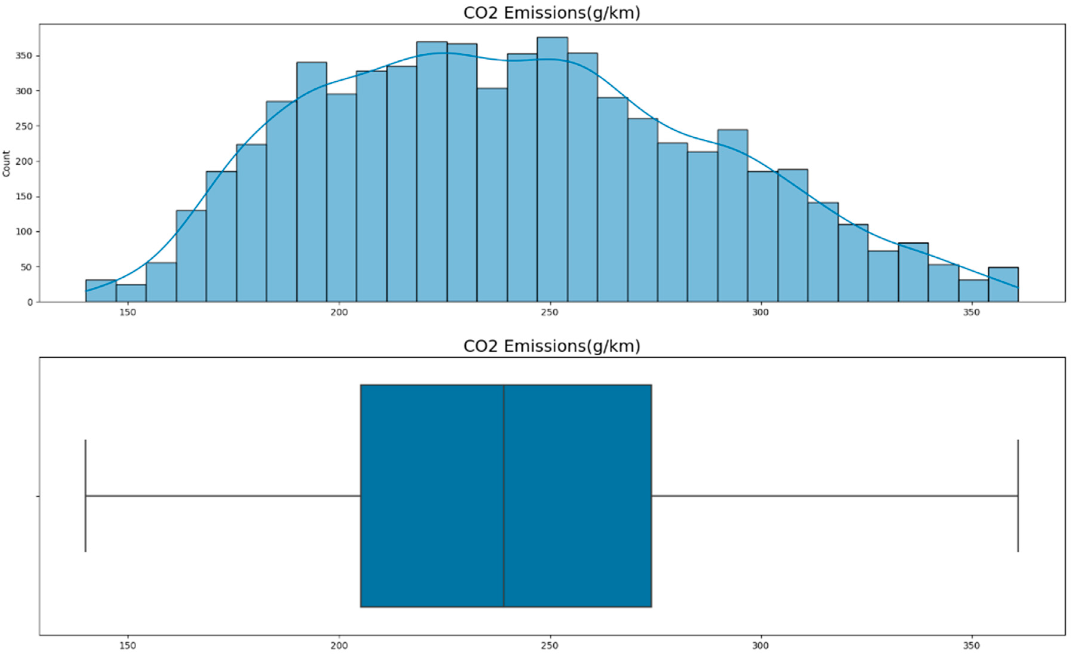 Figure 6 gives a graphical representation of the dispersion of emissions in all the vehicles in the dataset. The first plot shown is a histogram with a density curve that maps out the distribution of emissions in terms of g/km and how frequent and dispersed they are. The histogram is positively skewed, suggesting that most vehicles produced between 180 and 260 g/km, and few vehicles are in the other bracket. The density curve extends the concept of the histogram more than it enlarges its value, as it smoothens the distribution and looks at the density of data in pollution concentration within any given dataset while amplifying any underlying trends.