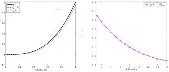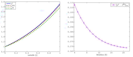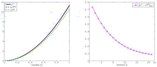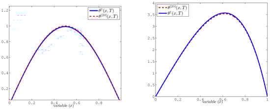 As shown in Figure 3 (left), even with an initial reconstructed solution far from the exact solution, the subsequent iterations rapidly reduce the discrepancy. Figure 3 (right) confirms that the error decreases steadily as the number of iterations k increases, and then its value becomes constant in fewer than 20 iterations. The obtained results confirm the method converges within a few iterations, even with the nonlinear forcing term, and the reconstructed solutions and (Figure 4) match the exact solutions closely.