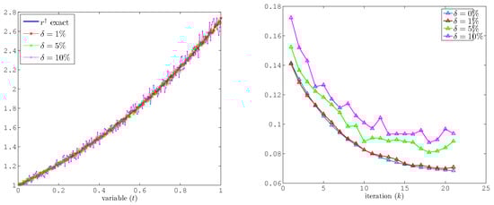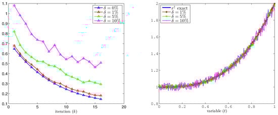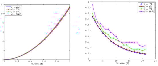 Figure 2 (left) further shows the reconstructed when the overspecified data are affected by different noise levels , and . In each case, the algorithm remains stable; while more noise degrades the recovered solution slightly, the shape and main features of the reconstructed solution remain recognizable. Likewise, Figure 2 (right) demonstrates that the iterative refinement is still effective under moderate noise levels, although more iterations are required for a larger noise level δ. While not explicitly mentioned, the iterative refinement in Algorithm 1 likely acts as implicit regularization, mitigating noise effects.