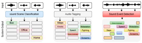- Heittola, T.; Çakır, E.; Virtanen, T. The Machine Learning Approach for Analysis of Sound Scenes and Events. In Computational Analysis of Sound Scenes and Events; Virtanen, T., Plumbley, M., Ellis, D., Eds.; Springer: Cham, Switzerland, 2017. [Google Scholar] [CrossRef]
